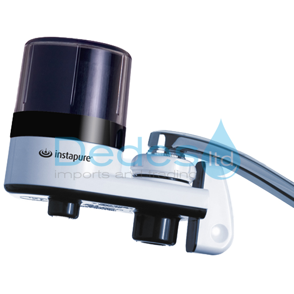 Φίλτρο νερού βρύσης από την Instapure με λευκό κορμό και διάφανο καπάκι.